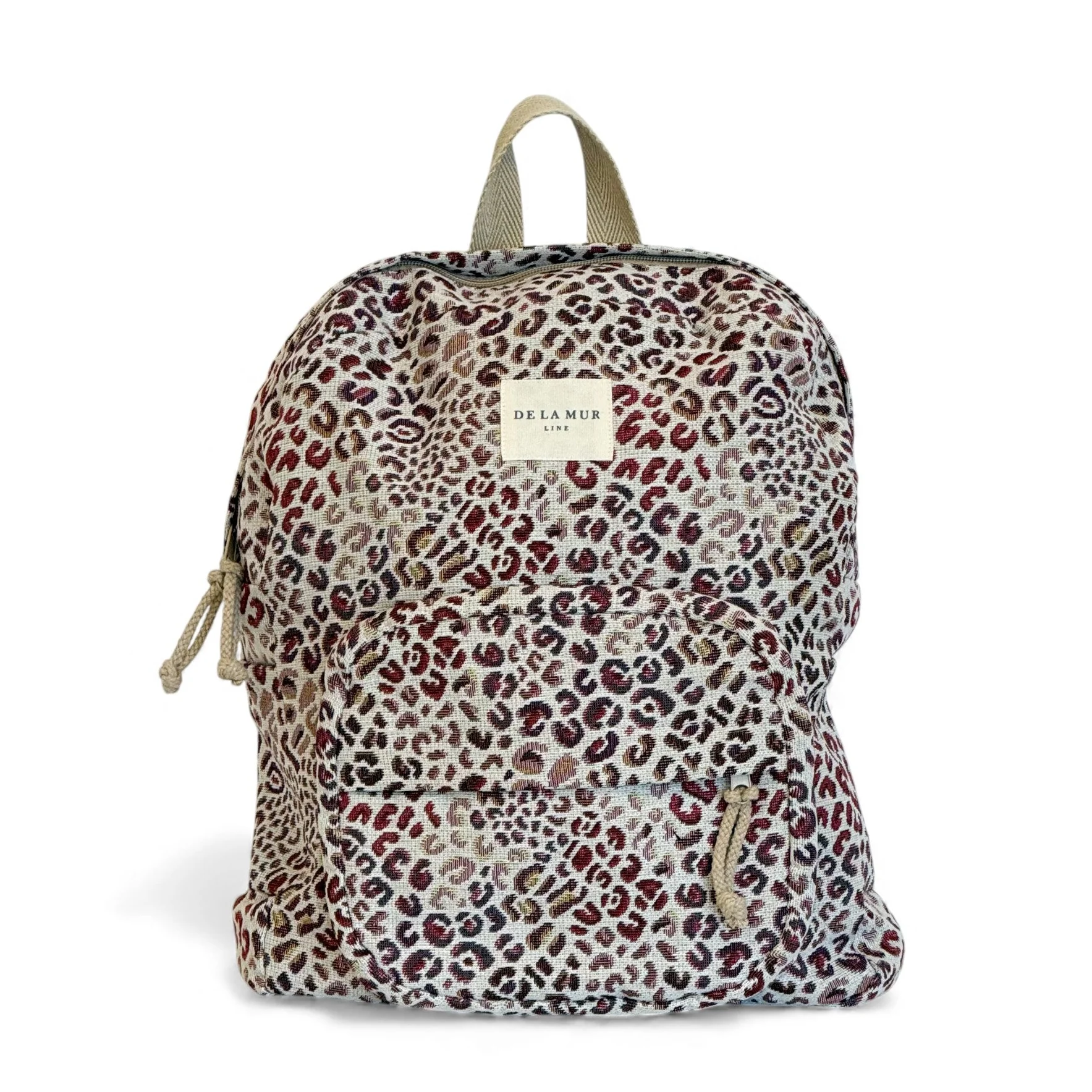 Backpack with Talcum Powder Pocket este un rucsac de damă realizat din jacquard gros cu imprimeu leopard în tonuri feminine de roz și lila. Un model clasic reinterpretat, cu formă ovală distinctivă și buzunar frontal practic.