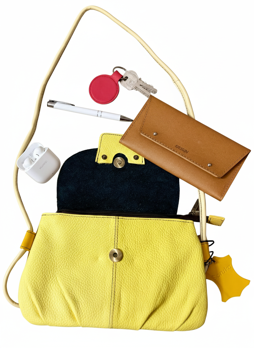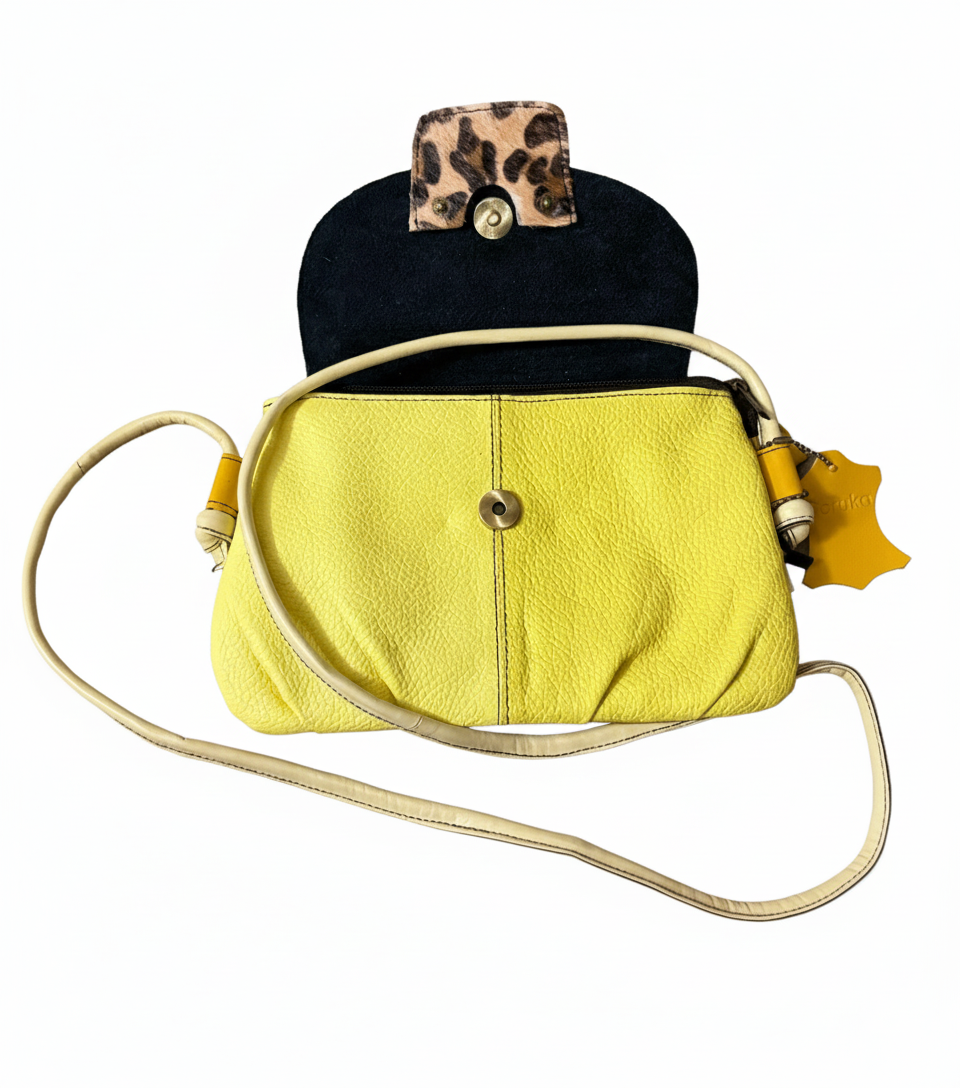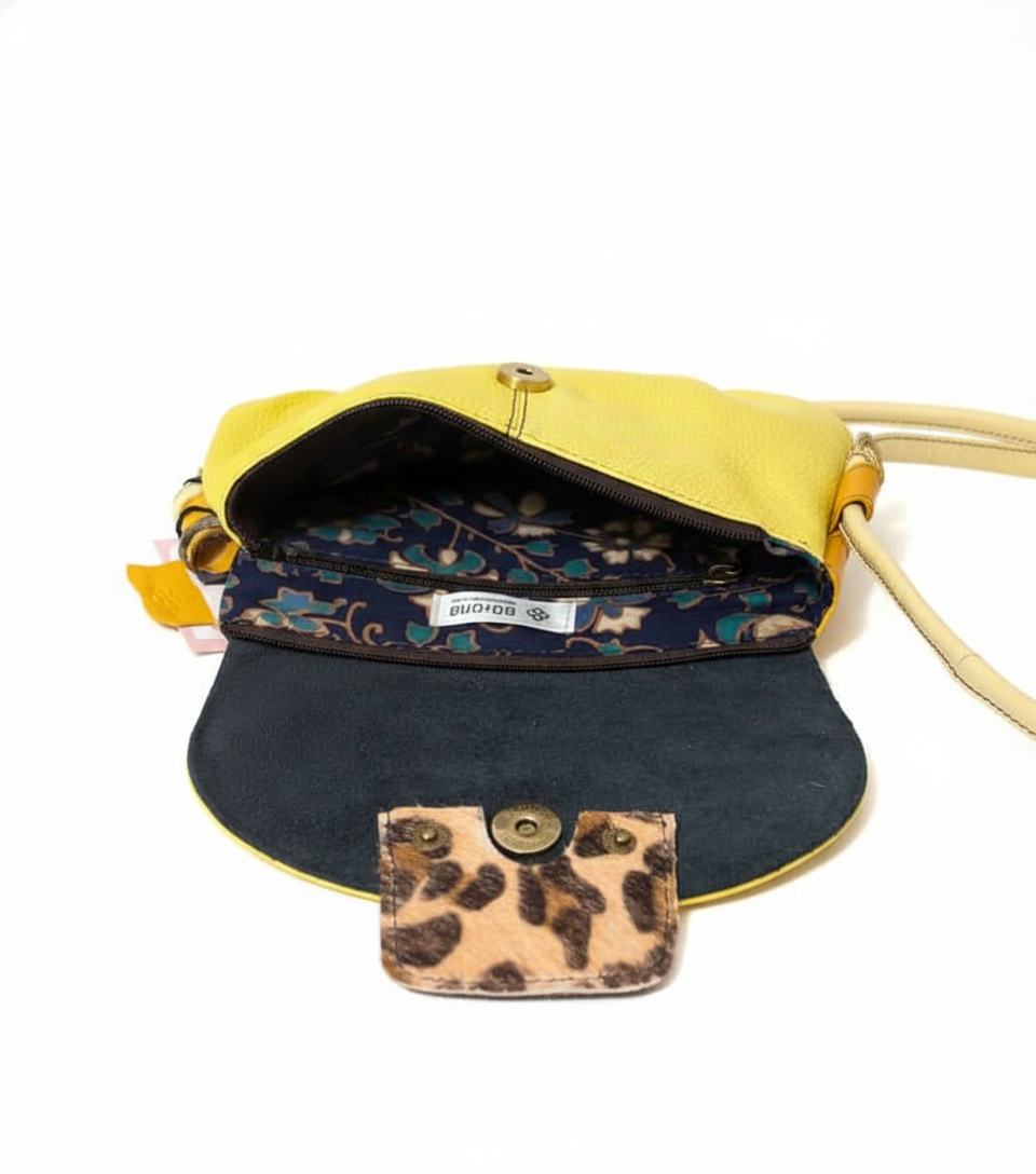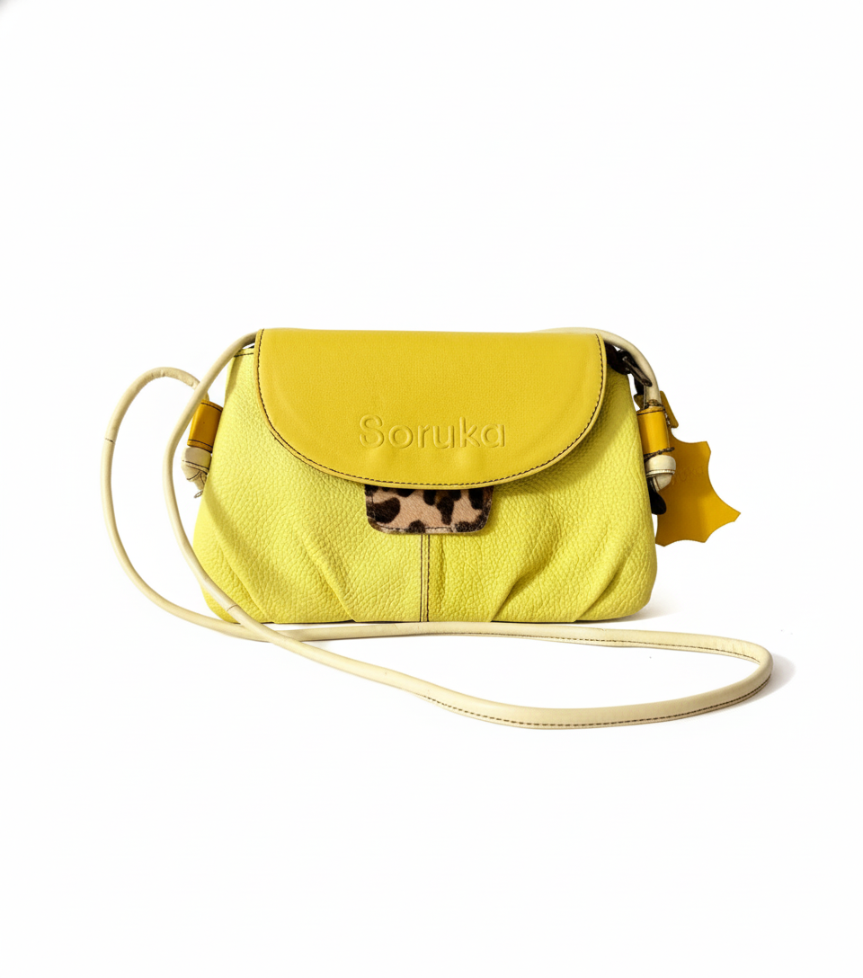 Adaugă o notă de energie și optimism ținutelor tale cu această geantă Soruka realizată manual din piele naturală reciclată.