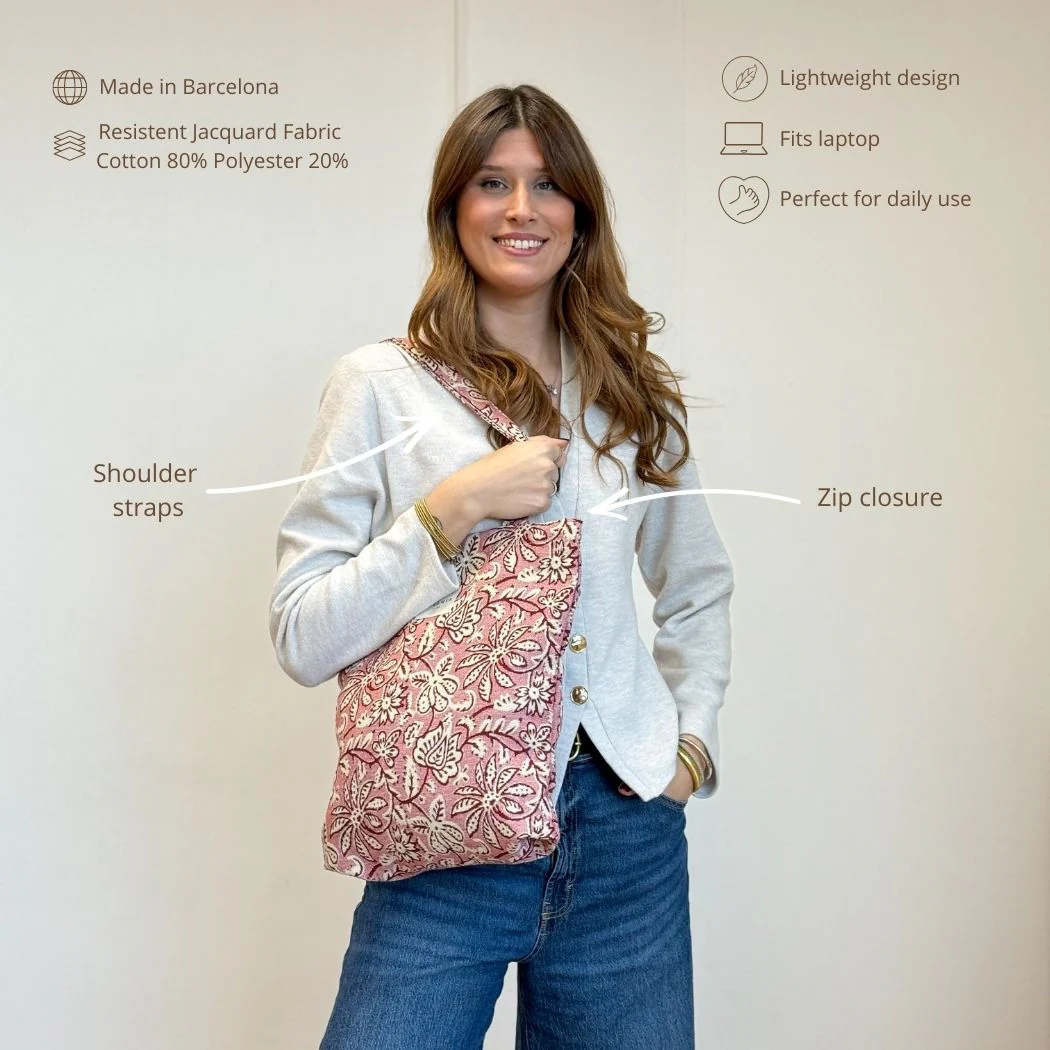 Geantă tip tote cu barete de umăr, realizată din jacquard gros (80% bumbac, 20% poliester), cu imprimeu floral delicat în nuanță ecru pe fundal roz.