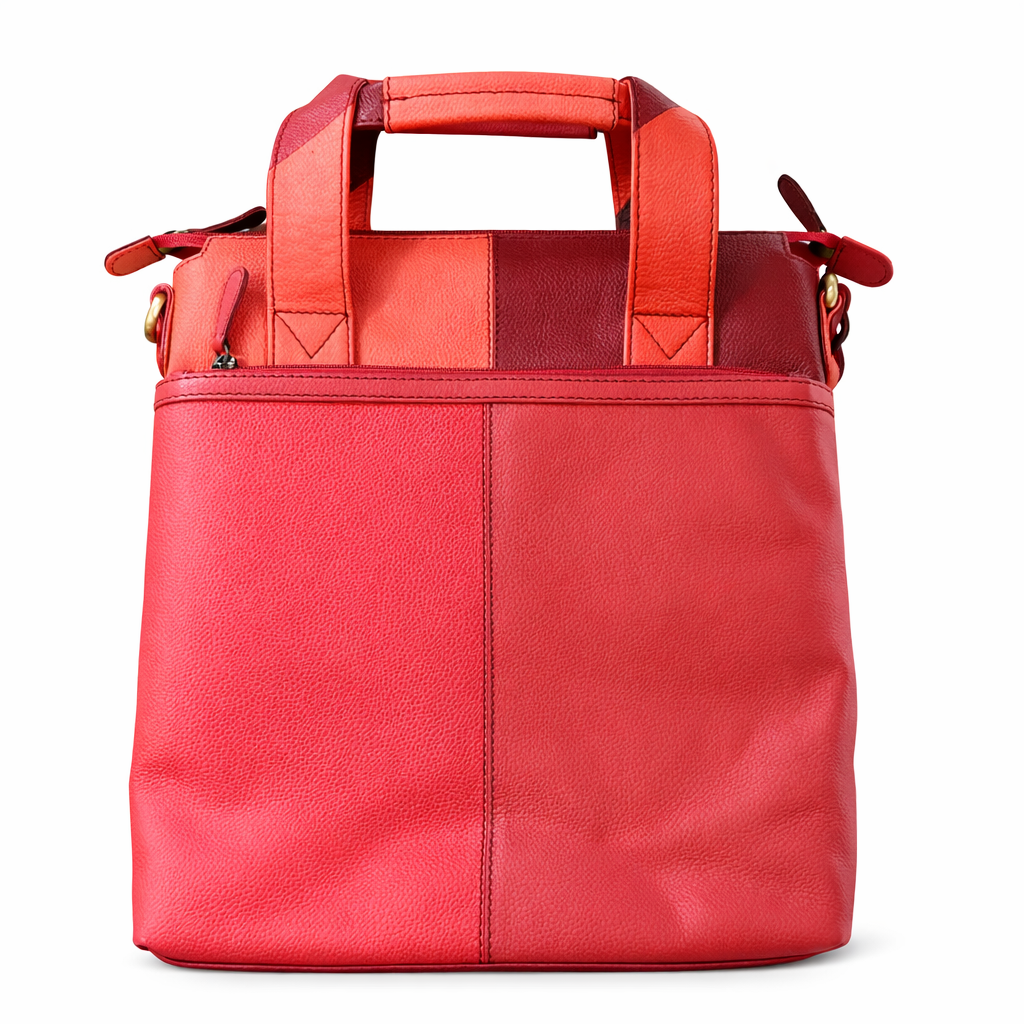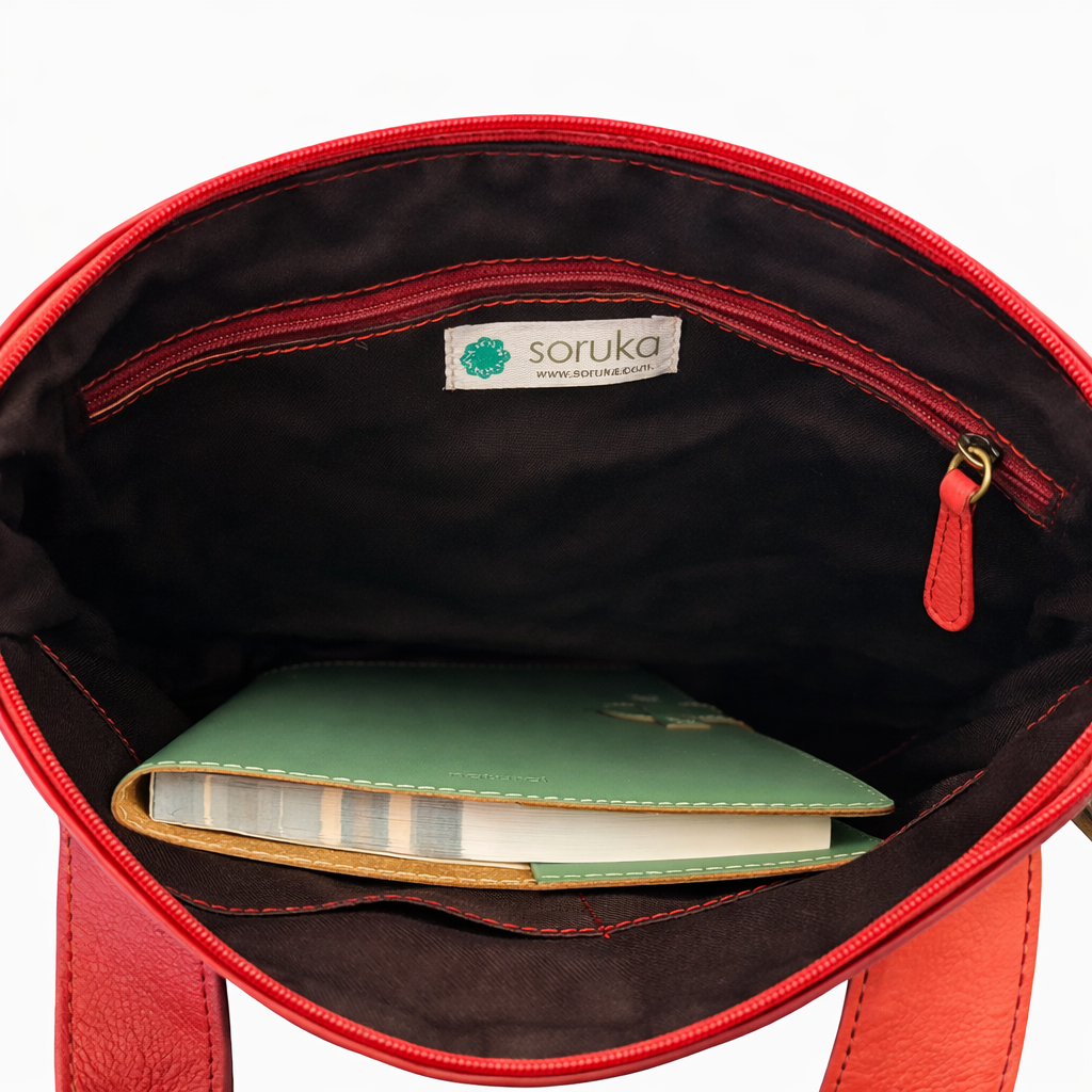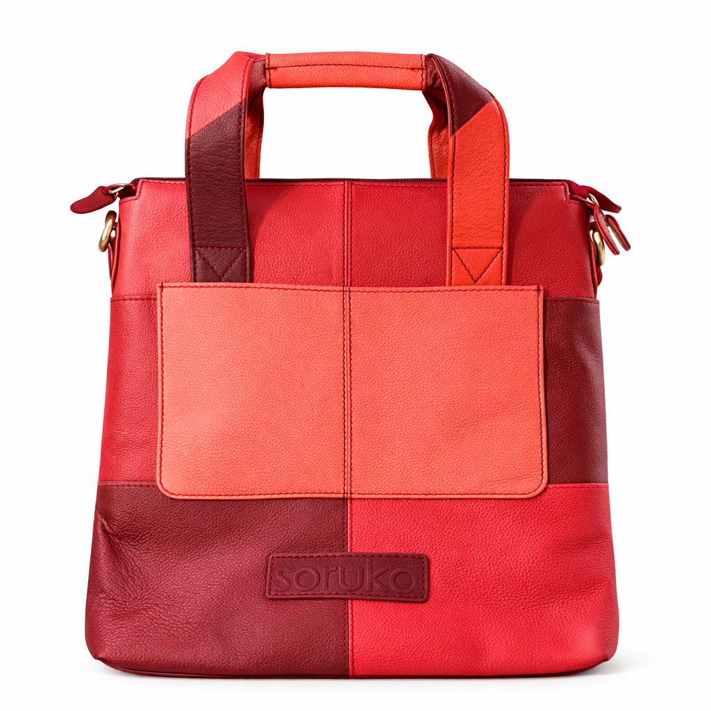 Această geantă Soruka este creată pentru femeia urbană care îmbină stilul cu funcționalitatea. Realizată manual din piele reciclată premium, în nuanțe sofisticate de roșu, corai și burgundy, geanta are un design arhitectural curat, perfect pentru birou, întâlniri sau viața de zi cu zi.