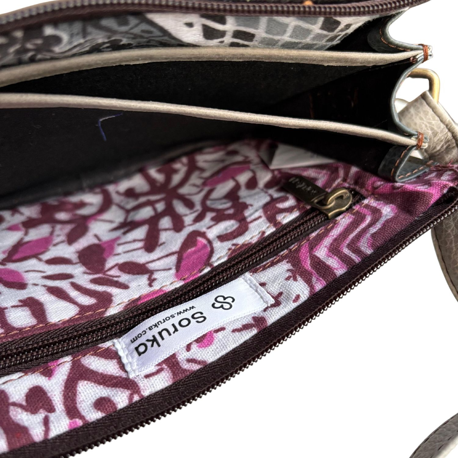 Această geantă mică Soruka este un accesoriu versatil și expresiv, realizat manual din piele naturală reciclată, cu design reversibil – două fețe diferite, pentru styling variat.