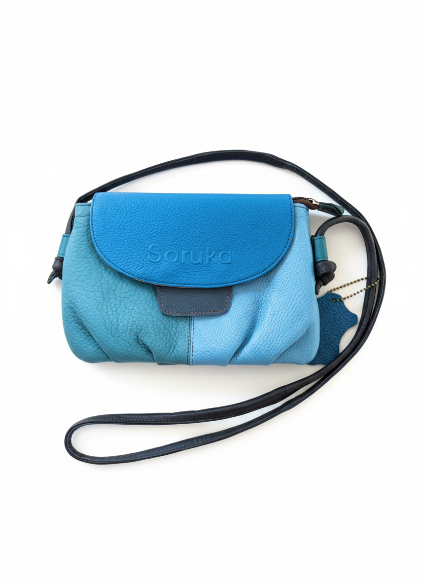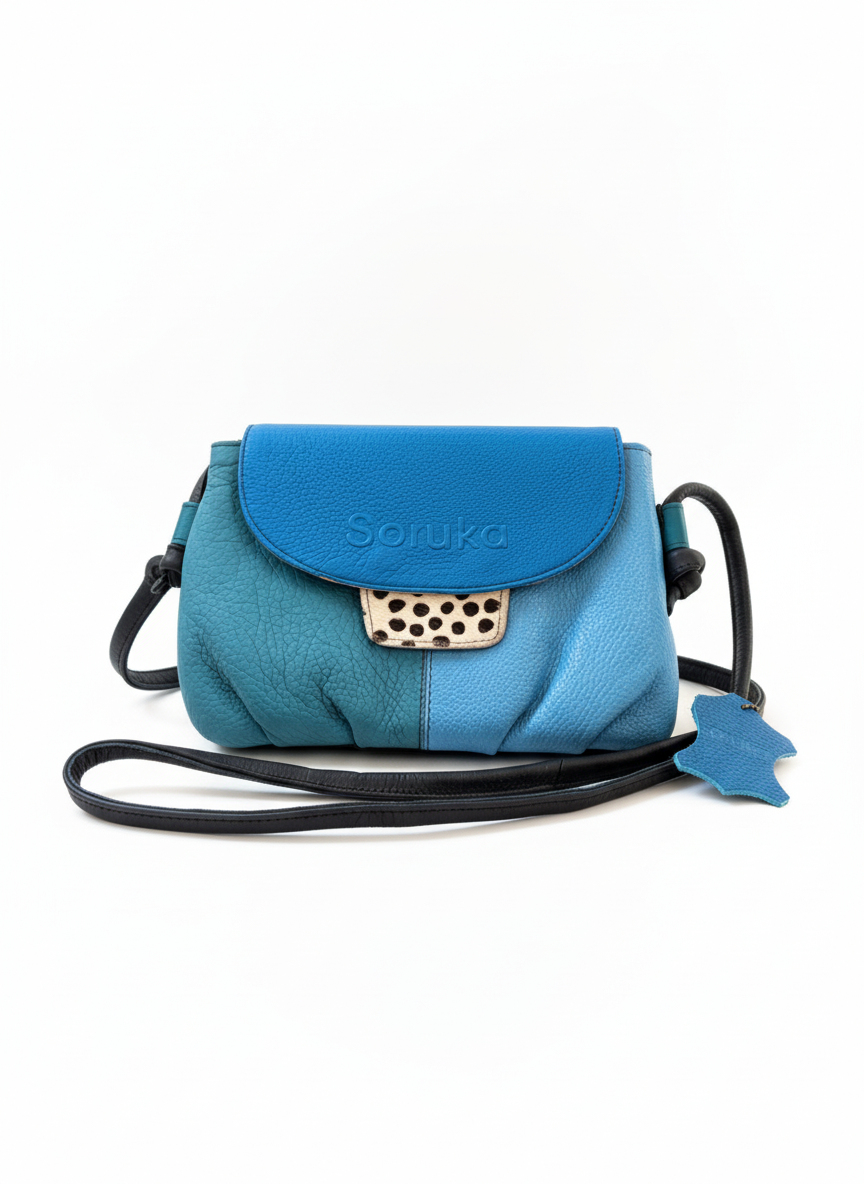 Rafinată, elegantă și atemporală — geanta Soruka în nuanțe de albastru regal și albastru închis este creată manual din piele naturală reciclată, transformând resturile din industria modei în artă purtabilă.