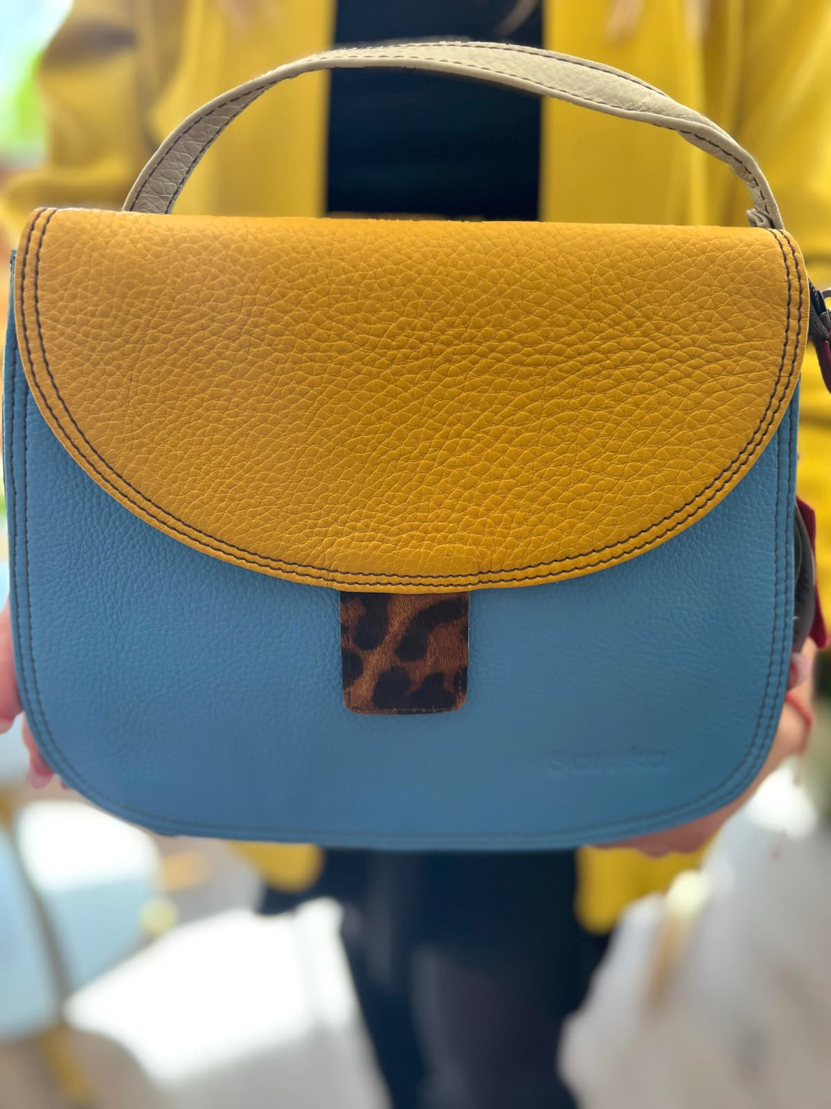 Geantă Soruka din piele reciclată – galben muștar & albastru deschis, cu detaliu animal print